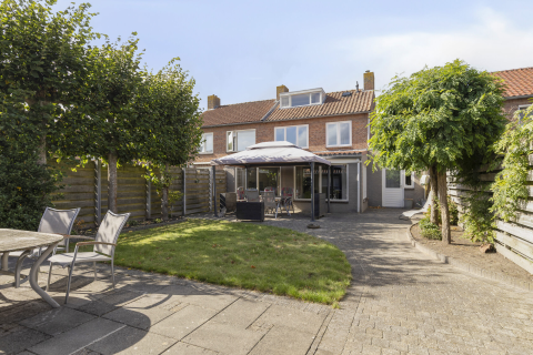 Achterin de tuin vind je een royale overkapping, ideaal om te loungen of buiten te eten, zelfs als het regent. Deze overkapping is ruim 3 meter diep en strekt zich uit over de volledige breedte van de tuin. De berging van 2,2 bij 4,9 meter biedt volop ruimte voor fietsen, tuinkussens en meer. Via de poort aan de achterzijde bereik je de brandgang.