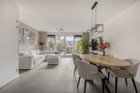 De woonkamer, gelegen aan de tuinzijde, is uitgebouwd en samen met de keuken maar liefst 53m² groot. Genoeg plek voor een gezellige eettafel én een comfortabele zithoek. Dankzij de grote ramen en schuifpui is het heerlijk licht binnen. Via zowel de schuifpui als de loopdeur loop je zo de tuin in. Perfect voor zomerse dagen: open de deuren en verbind binnen met buiten!